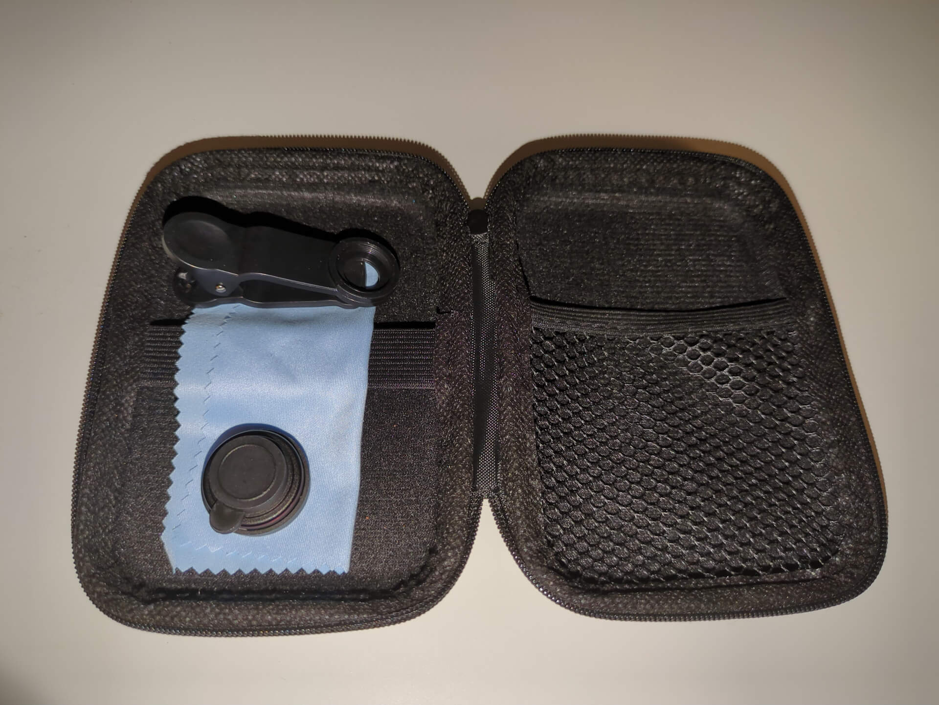 Lentille macro adaptable sur tous les téléphones grâce à un système de pince. Livrée dans une house de protection avec un chiffon de nettoyage.